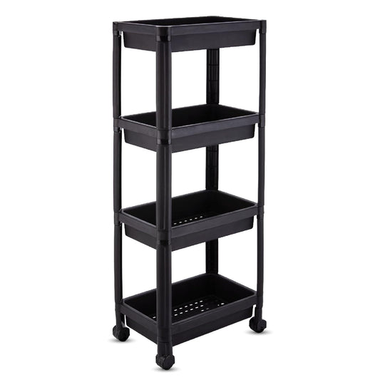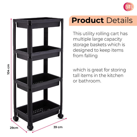 4-Tier Rolling Organizer Shelf Unit with Handles, Storage Trolley Cart with Wheels, Plastic Shelving Unit with Mesh Basket Shelves, Narrow Utility for Kitchen, Bathroom, Laundry, and Office
