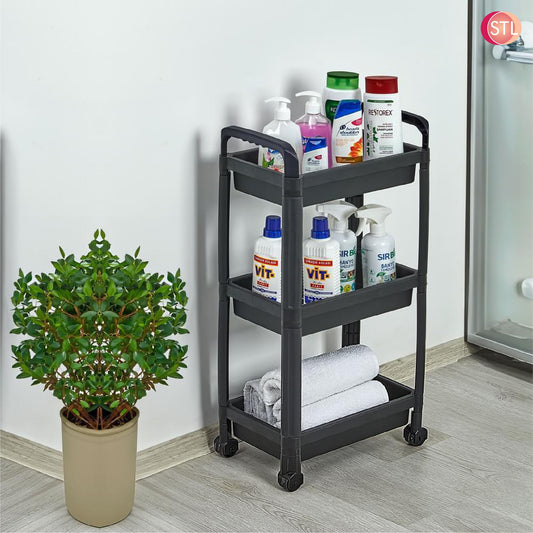 STL 3-Tier Plastic Storage Cart with 2 Sturdy Handle, Rolling Utility Cart with 3 Baskets, Space Saving Organizer for Kitchen, Bathroom, Office and Living Room