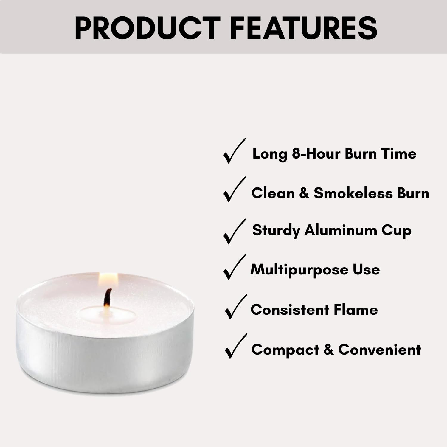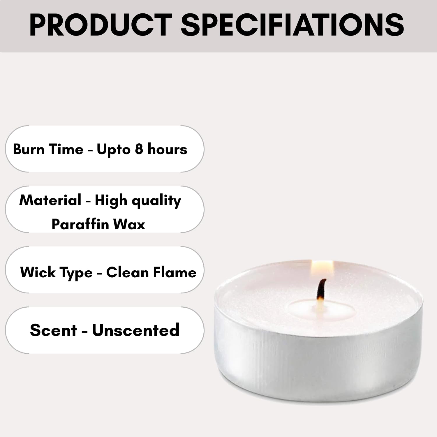 Our Premium 8-Hour Tea Lights provide long-lasting, clean, and smokeless illumination, making them the perfect choice for any occasion. With a burn time of up to 8 hours per tea light, these unscented candles are ideal for weddings, parties, restaurants, and home décor, offering consistent, ambient lighting throughout the event. Crafted with high-quality materials, each tea light delivers a reliable, pure glow, enhancing your space with a soft, inviting warmth. Whether used in oil burners, wax tart burners, or as standalone centrepieces, these tea lights are versatile and perfect for creating a romantic or serene atmosphere. Available in a bulk, they offer excellent value for money, ensuring you have enough for multiple occasions.